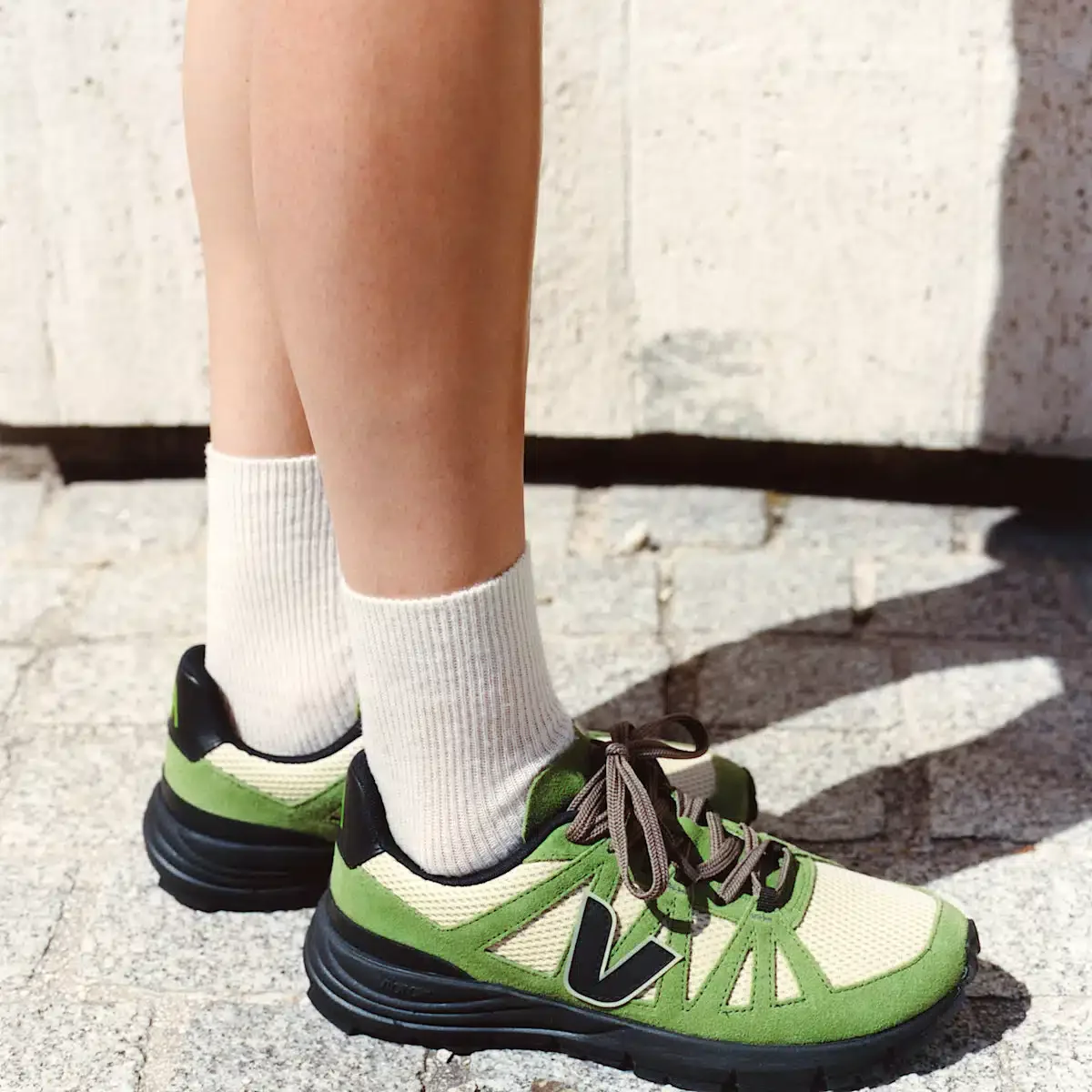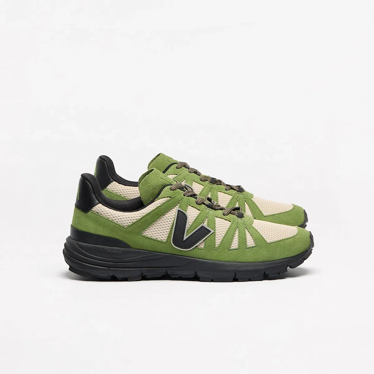 The pair features a Vibram sole. Co-developed with VEJA, this sole merges ecological materials, such as Amazonian rubber and sugarcane-based E.V.A., with Vibram’s cutting-edge technology. - Upper: Alveomesh (100% recycled polyester)